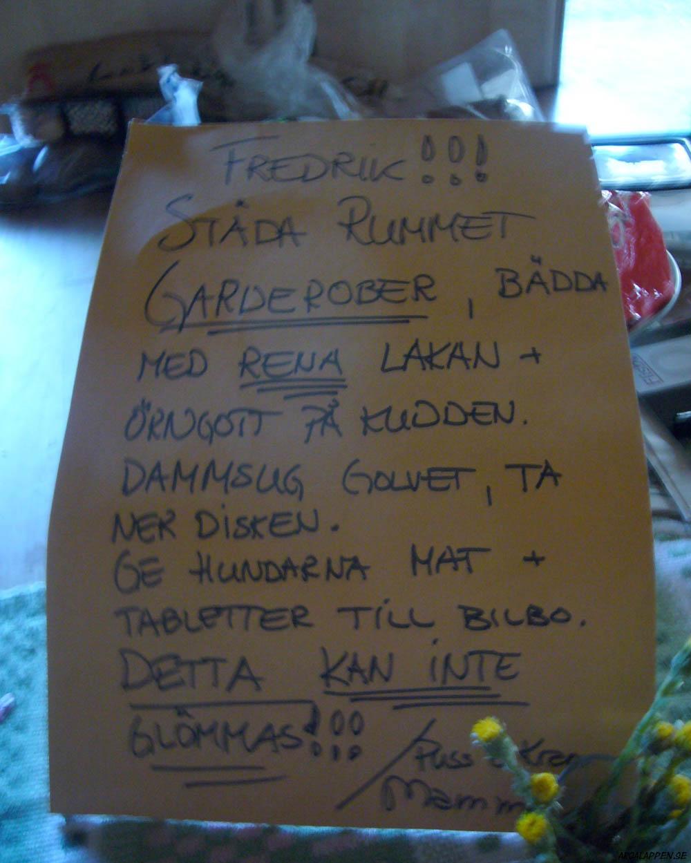 Åh, vad jag saknar tiden då man bodde hemma och vaknade till årets finaste dag, bara för att hitta en att-göra-lista lång som gamla testamentet på köksbordet. Notera för övrigt det lama försöket att blidka sonens kommande vrede med hjälp av en bukett tussilago.