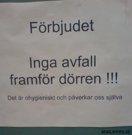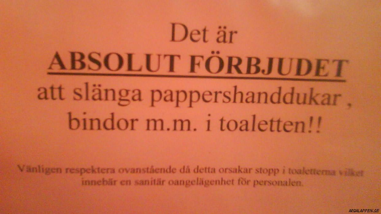 "Vänligen respektera ovanstående då detta orsakar stopp i toaletterna vilket innebär en sanitär oangelägenhet för personalen."