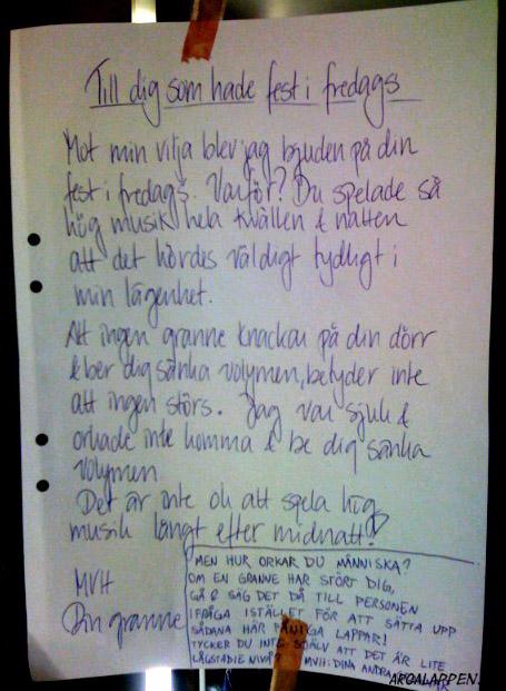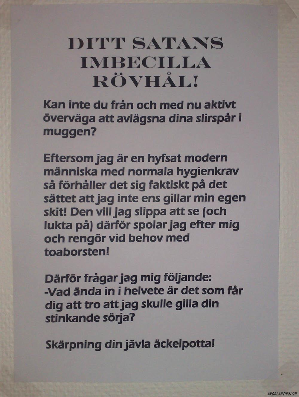 Arga Lappen är en blogg som frossar i de där små subtila budskapen vi människor kommunicerar med i köket, i förrådet, i tvättstugan, ja i princip överallt där vi delar utrymme och umgås (eller inte) med andra.