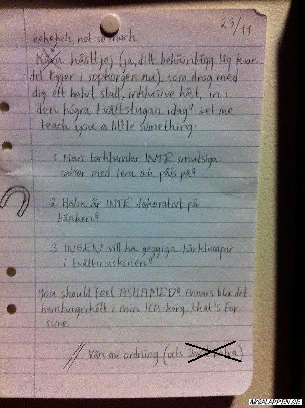 Arga Lappen är en blogg som frossar i de där små subtila budskapen vi människor kommunicerar med i köket, i förrådet, i tvättstugan, ja i princip överallt där vi delar utrymme och umgås (eller inte) med andra.