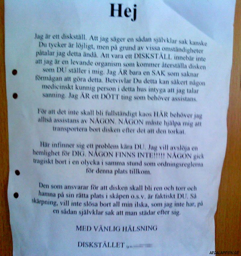 Om ändå lappskrivaren kunde lägga ned lika mycket tid och omsorg på sitt arbete som att skriva onödiga lappar så kanske samhället åtminstone hade varit LITE bättre att leva i...