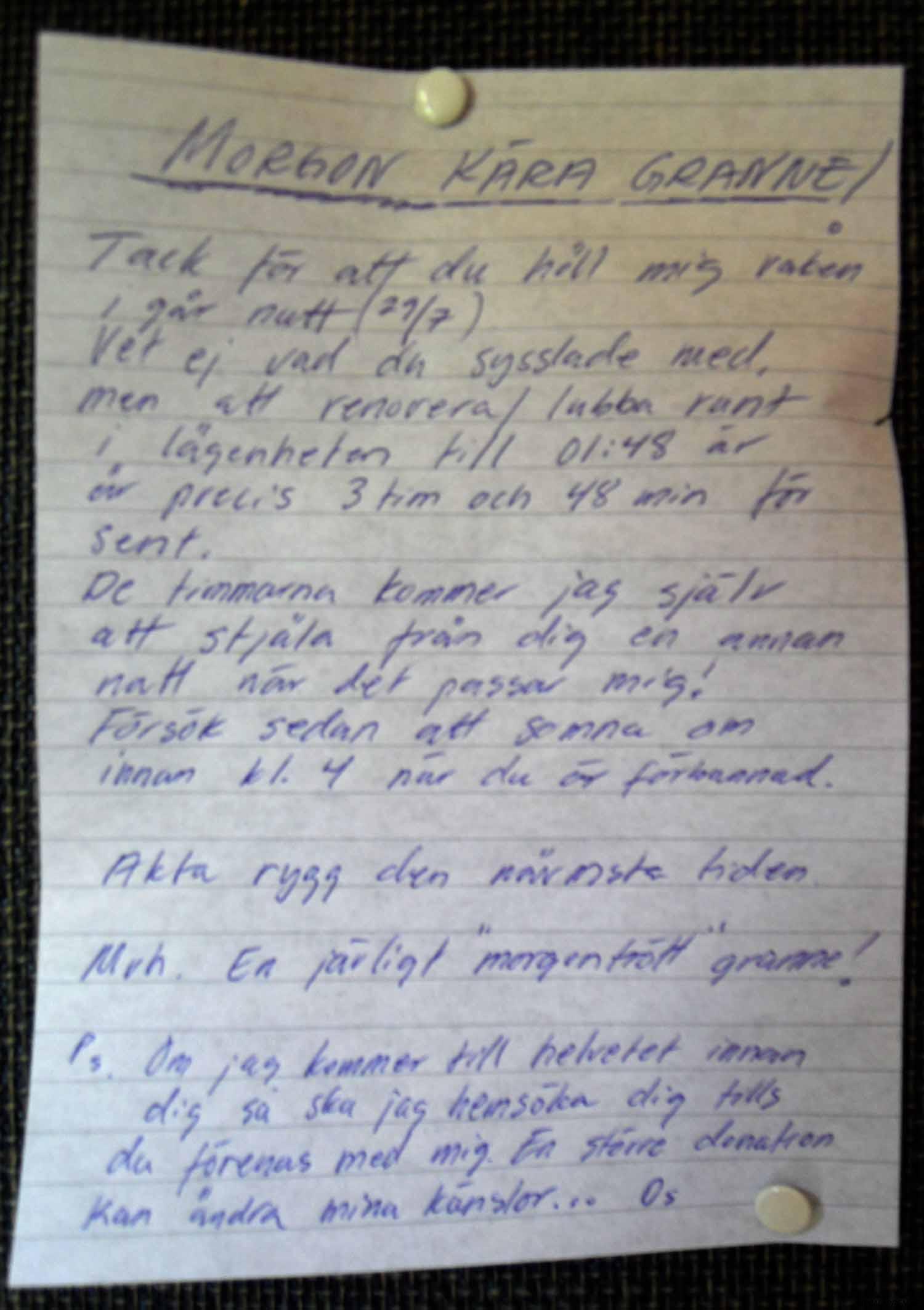 "...Tack för att du höll mig vaken i går natt (29/7). Vet ej vad du sysslade med, men att renovera/lubba runt i lägenheten till 01:48 är är precis 3 tim och 48 min för sent.