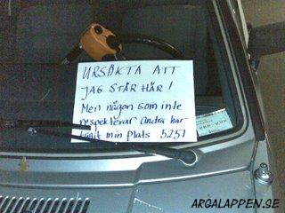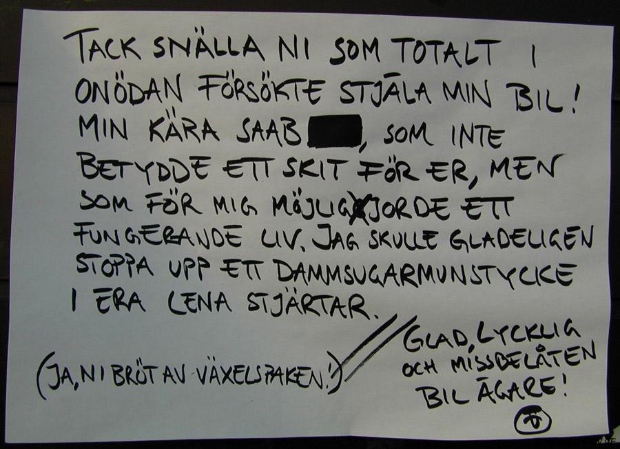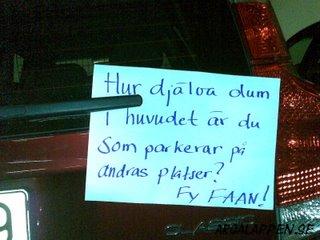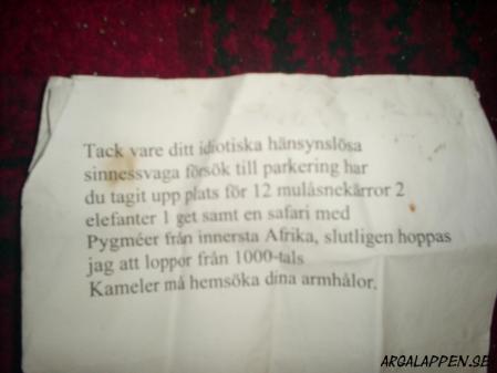 "Tack vare ditt idiotiska hänsynslösa sinnessvaga försök till parkering har du tagit upp plats för 12 mulåsnekärror 2 elefanter 1 get samt en safari med Pygméer från innersta Afrika, slutligen hoppas jag att loppor från 1000-tals Kameler må hemsöka dina armhålor"