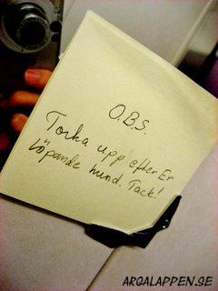 Sara berättar: Idag när jag klev in i hissen möttes jag av ett kletigt golv. Kors i taket, måste jag säga då jag vet att vi har en manisk tant som tvunget måste städa hissen minst en gång i veckan. Man såg på sju mils avstånd att det rörde sig om köttsaft som droppat från en tallrik eller liknande. Inte så konstigt med tanke på att det var gemensam grillning i kvarteret några timmar tidigare. Jag blickar upp på spegeln och möts av denna lapp. Den hunden hade jag gärna velat se.