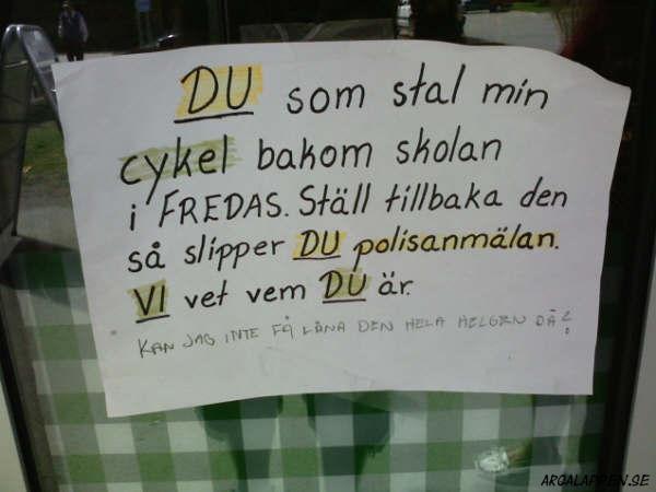 Folk som skriver den här typen av lappar verkar alltid veta vem förrövaren är. Varför inte ringa på hos kändisen och kräva jonnen tillbaka i så fall...