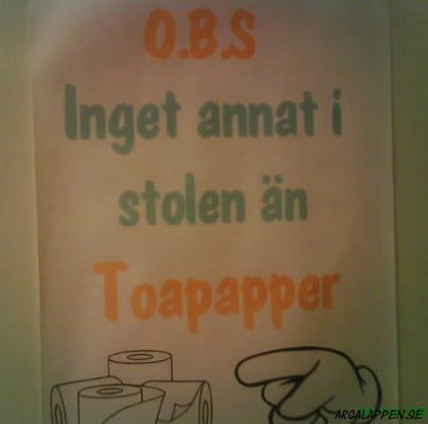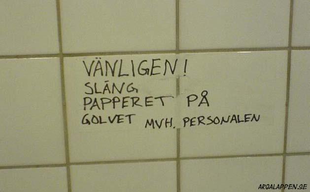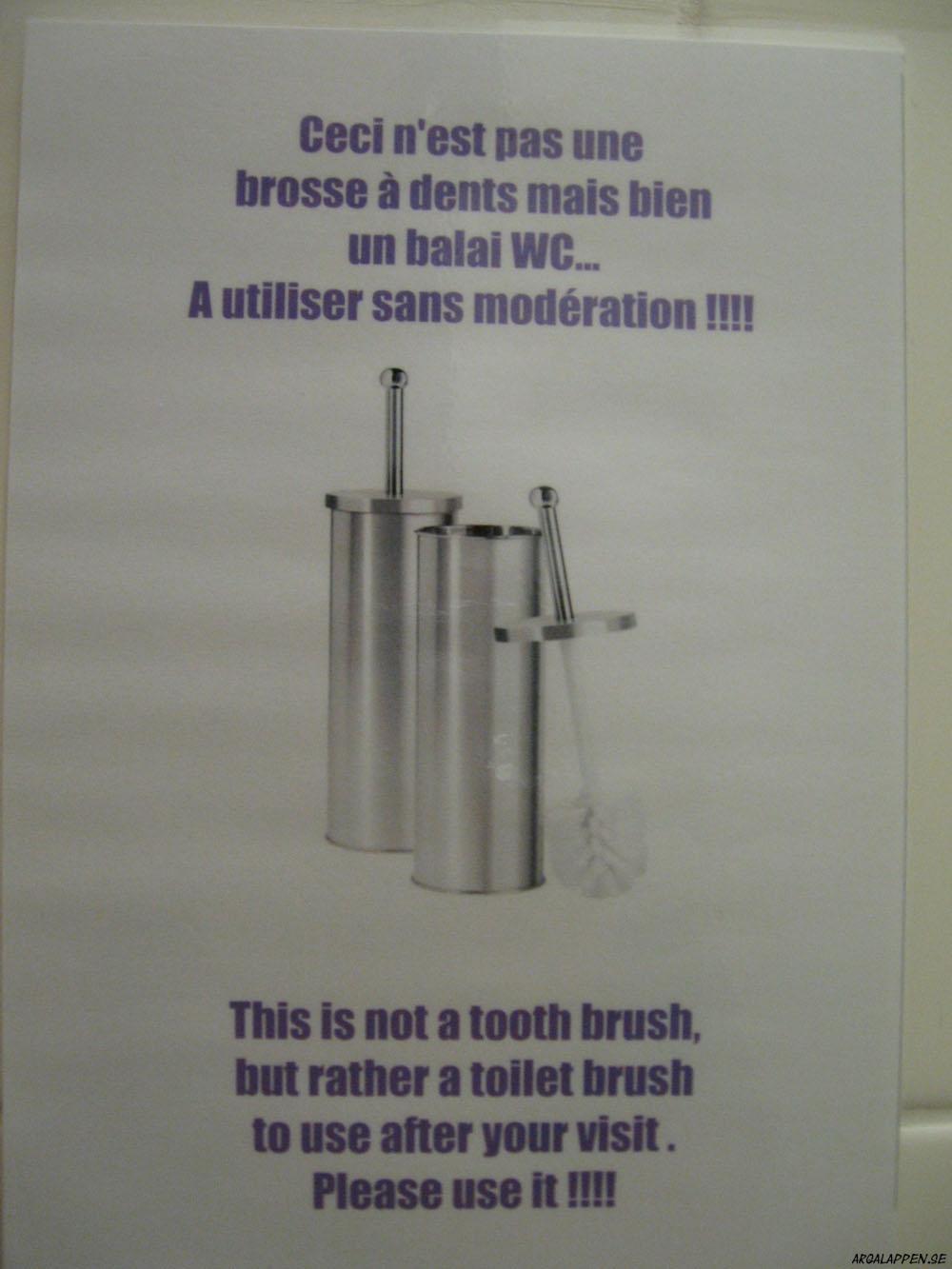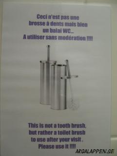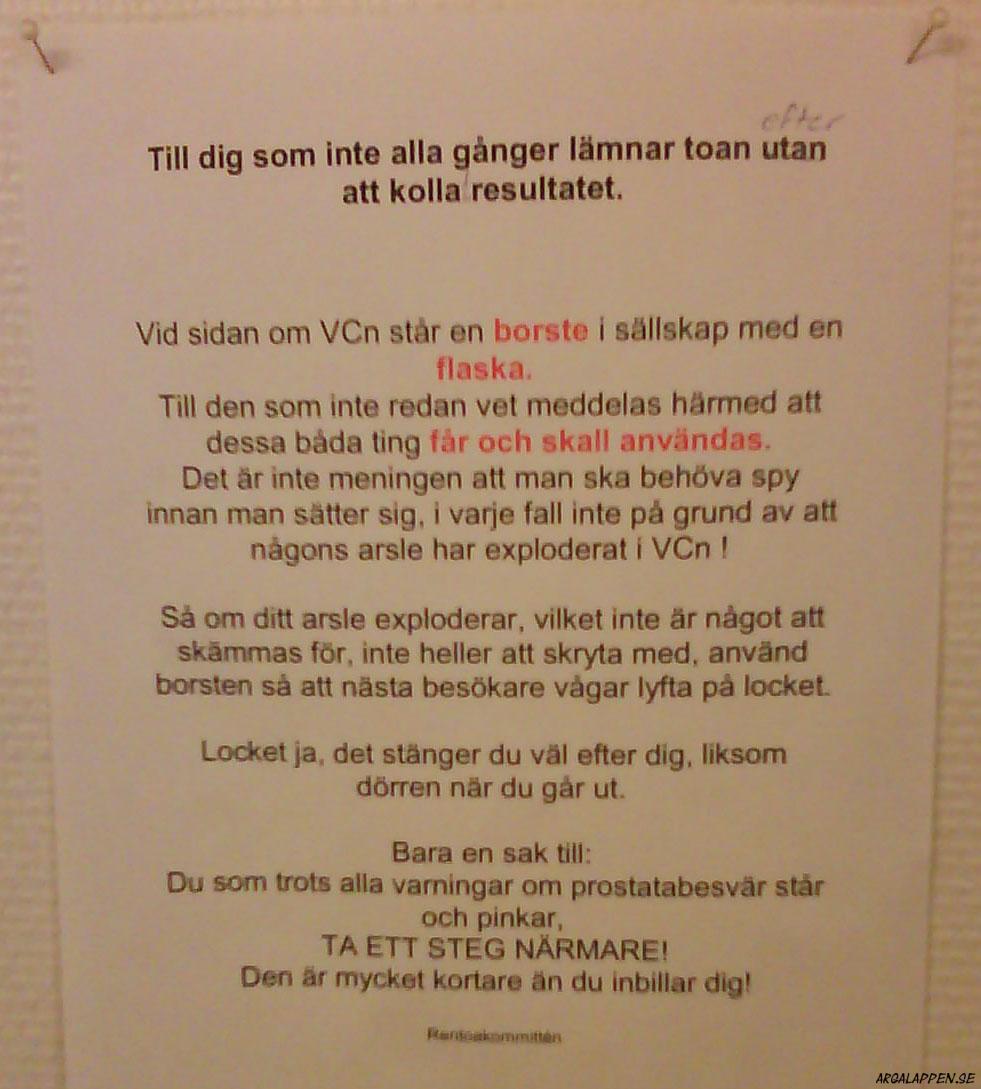 "Vid sidan om VCn står en borste i sällskap med en flaska. Till den som inte redan vet meddelas härmed att dessa båda ting får och skall användas. Det är inte meningen att man ska behöva spy innan man sätter sig, i varje fall inte på grund av att någons arsle har exploderat i VCn!