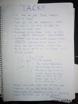 För ännu en helt jävla underbar start på dagen. Inget går upp mot morgonsolens strålar som lyser in och värmer ens fötter som sticker ut utanför täcket. Fågelkvittret hörs mellan låtarna som spelas av den MEST TROLIGT DÖVSTUMMA GRANNE, som förutom besitter världens i särklass VÄRSTA musiksmak, varken värderar sin hörsel eller sina framtänder särskilt högt. Nu är det så att DU bor i en lägenhet i Luleå. Låt mig illustrera (se karta). 1. Luleå 2. Träd och mygg. Jag skulle rekommendera att du flyttade till punkt 2. Där kan ni vräka på allt vad ni orkar... O.s.v."