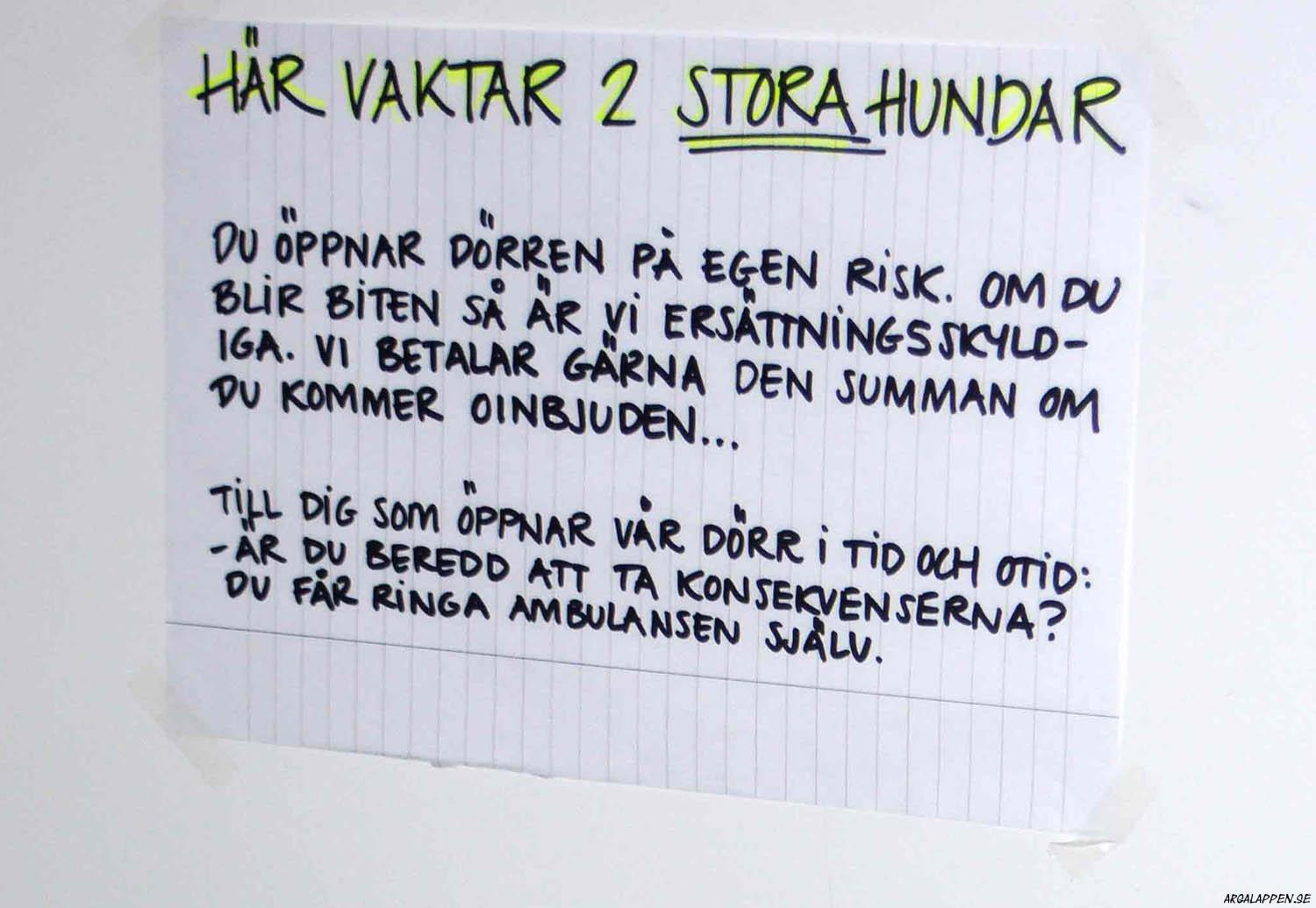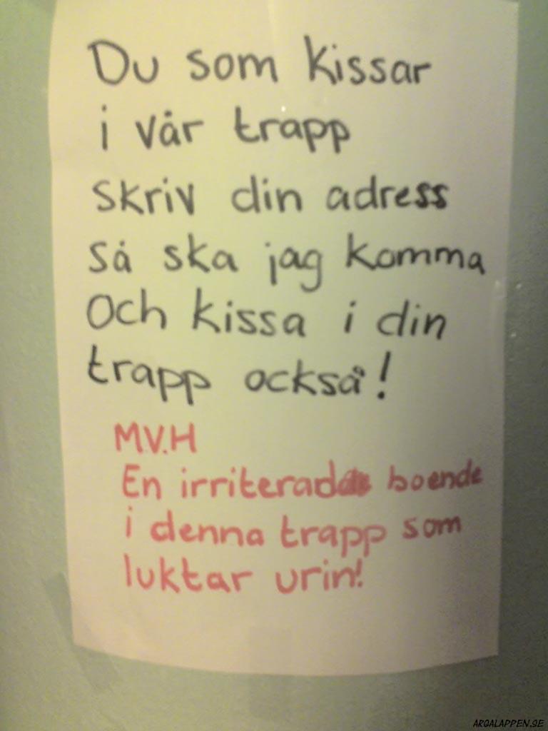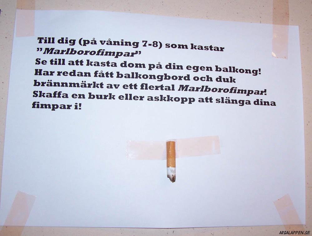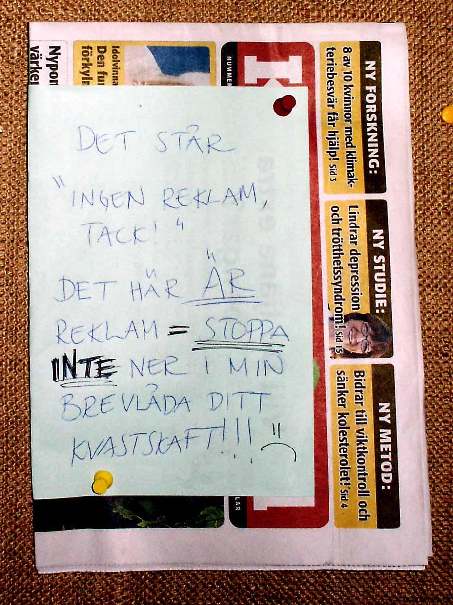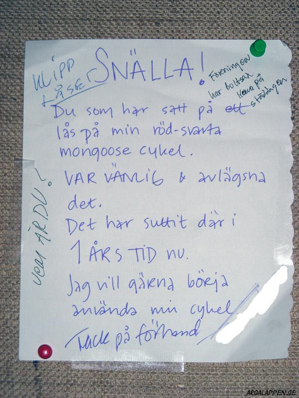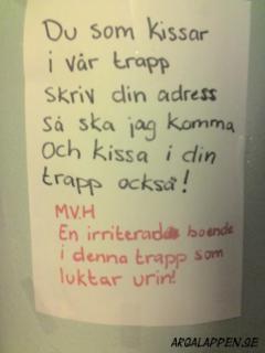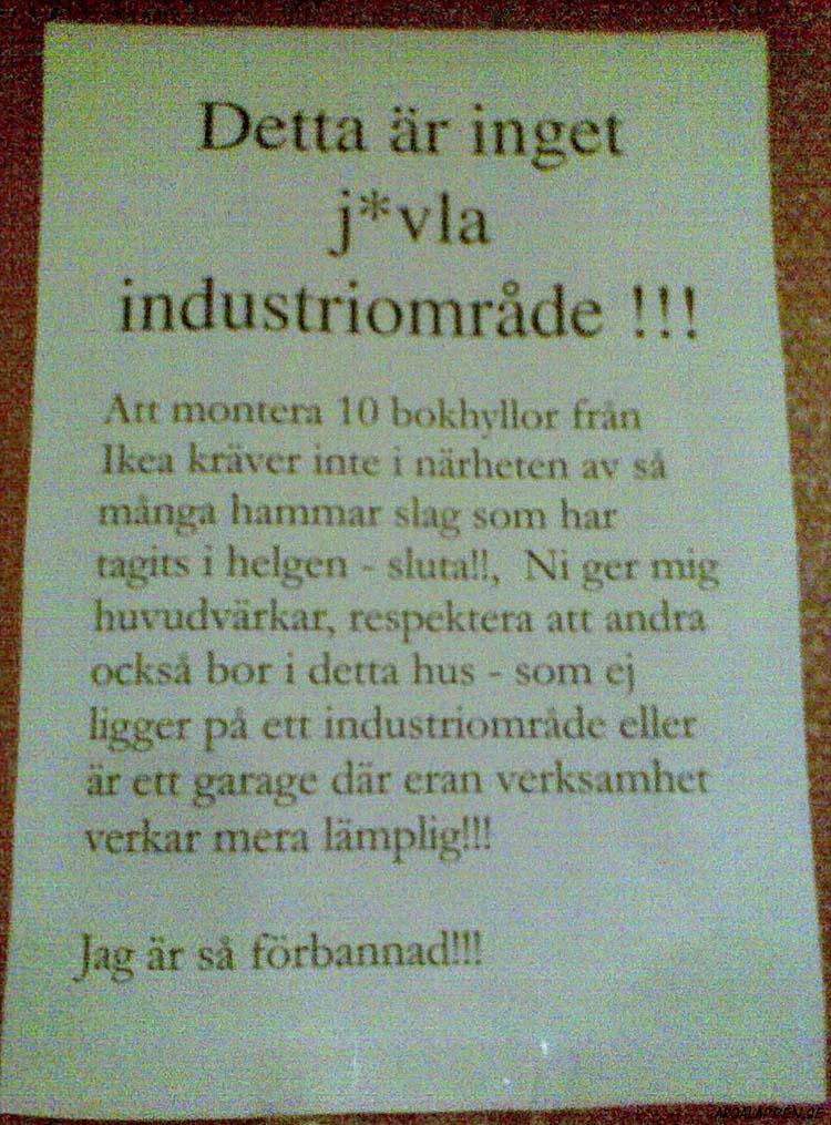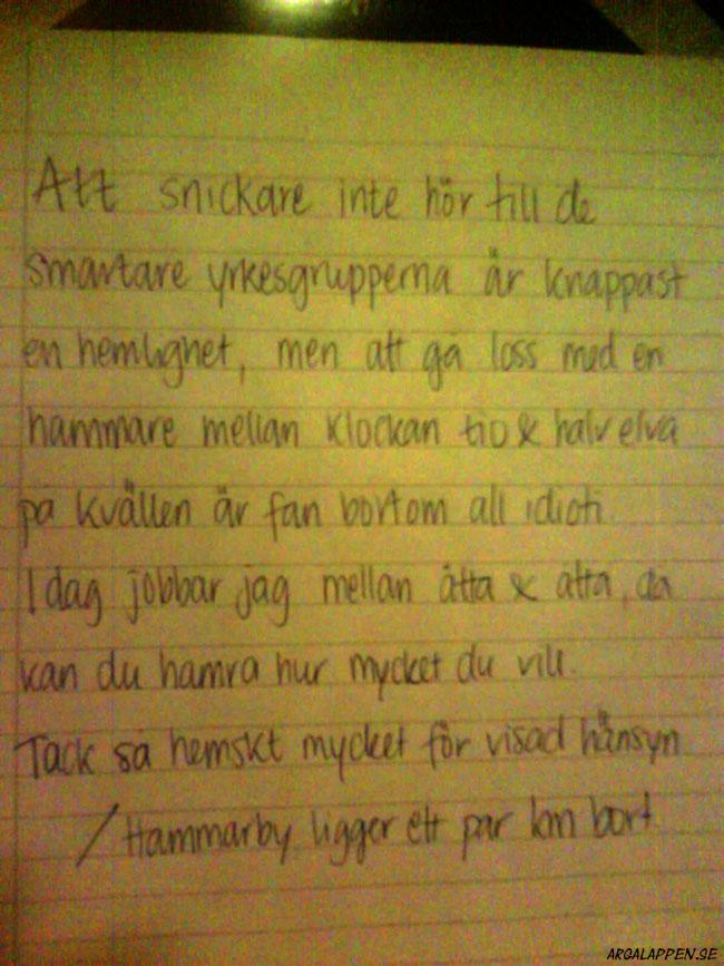 "Att snickare inte hör till de smartare yrkesgrupperna är knappast en hemlighet, men att gå loss med en hammare mellan klockan tio & halv elva på kvällen är fan bortom all idioti. Idag jobbar jag mellan åtta & åtta, då kan du hamra hur mycket du vill. Tack så hemskt mycket för visad hänsyn /Hammarby ligger ett par km bort"