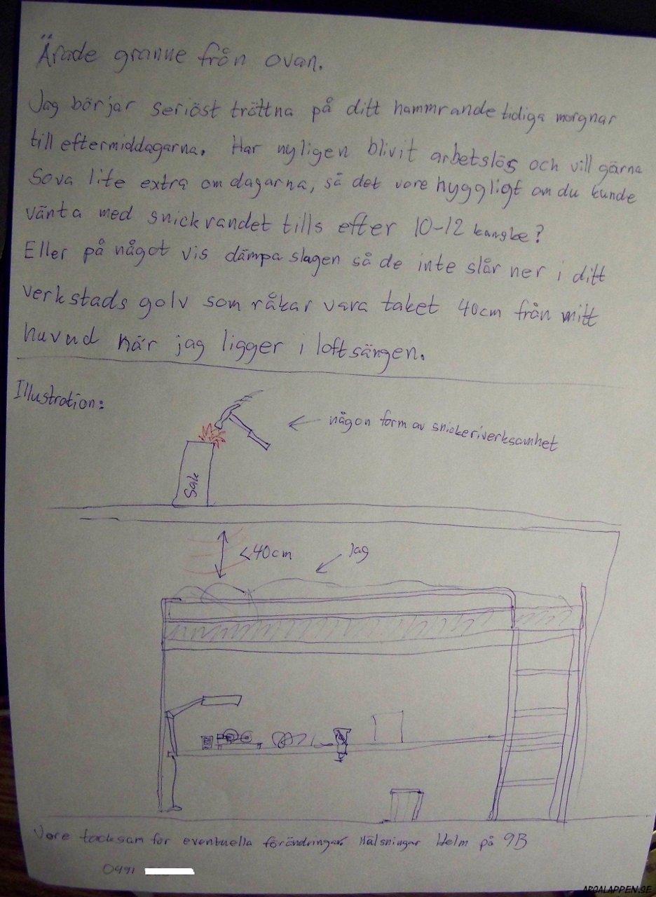 - Nu får det vara nog! I tre månaders tid har vi vaknat av att det plumsar i toaletten tidigt på morgonen. Det har väckt hela familjen åtskilliga gånger. Vad ska vi säga till barnen när de undrar vad det är som låter? Kan ni inte vara vänliga och visa oss den hänsyn alla förtjänar. Om detta fortsätter tvingas vi ta kontakt med bostadsvärden. TACK! /Grannarna på 2an