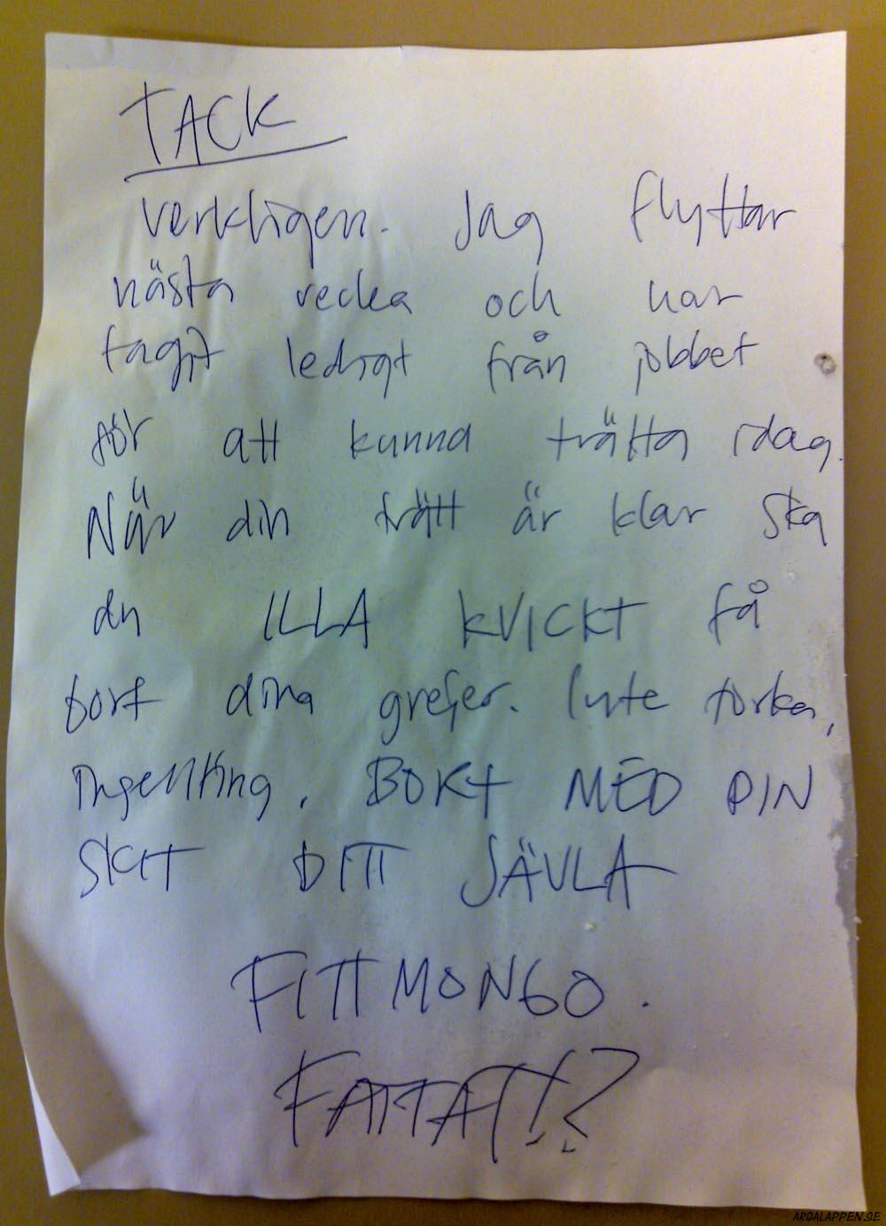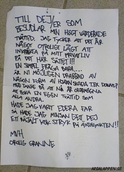 Inledningen på den här lappen är bara så otroligt härlig. Inga krussiduller, inga ursäktande ordvändningar... Håkan är helt enkelt jävligt förbannad. Punkt.