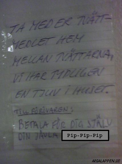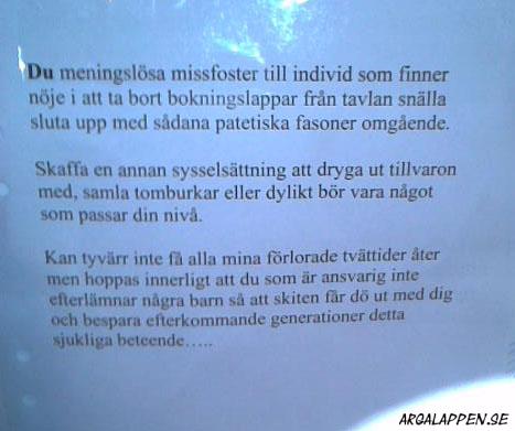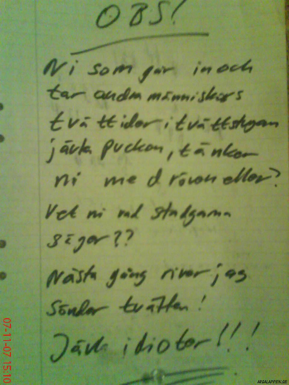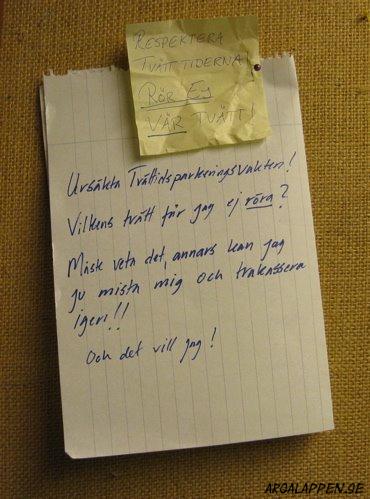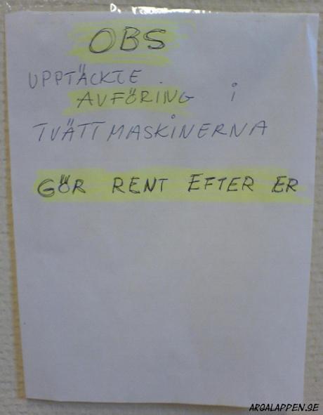 Det som är skönast med denna lapp är nog den sakliga tonen, trots den tämligen grova förseelsen som påpekas. Det skulle lika gärna kunna stå "glöm inte att rengöra filtret från ludd".