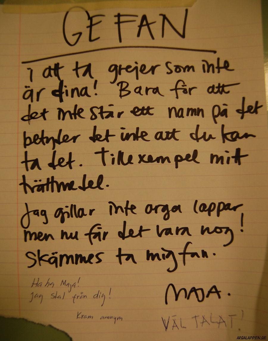 "GE FAN i att ta grejer som inte är dina! Bara för att det inte står ett namn på det betyder det inte att du kan ta det. Till exempel mitt tvättmedel.
